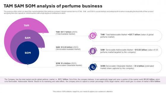 The purpose of this slide is to depict the market potential of the perfume companys target market in terms of TAM, SAM, and SOM to assist startups and enterprise firms alike in evaluating the feasibility of their product and giving them the capacity to solicit investors with a high degree of confidence in return. Take your projects to the next level with our ultimate collection of Perfume Manufacturing Business Plan Tam Sam Som Analysis Of Perfume Business BP SS V. Slidegeeks has designed a range of layouts that are perfect for representing task or activity duration, keeping track of all your deadlines at a glance. Tailor these designs to your exact needs and give them a truly corporate look with your own brand colors they will make your projects stand out from the rest The purpose of this slide is to depict the market potential of the perfume companys target market in terms of TAM, SAM, and SOM to assist startups and enterprise firms alike in evaluating the feasibility of their product and giving them the capacity to solicit investors with a high degree of confidence in return.