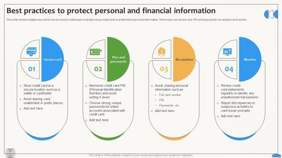 This slide shows multiple ways which can be used by individuals or people using credit cards to protect their personal information. These ways are secure card, PIN and passwords, be cautious and monitor. Want to ace your presentation in front of a live audience Our Best Practices To Protect Personal And Financial Swipe Smartly A Practical Guide Fin SS V can help you do that by engaging all the users towards you. Slidegeeks experts have put their efforts and expertise into creating these impeccable powerpoint presentations so that you can communicate your ideas clearly. Moreover, all the templates are customizable, and easy-to-edit and downloadable. Use these for both personal and commercial use. This slide shows multiple ways which can be used by individuals or people using credit cards to protect their personal information. These ways are secure card, PIN and passwords, be cautious and monitor.