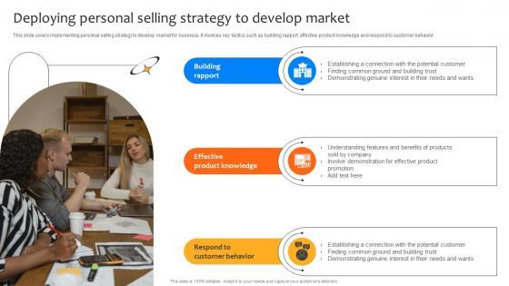 This slide covers implementing personal selling strategy to develop market for business. It involves key tactics such as building rapport, effective product knowledge and respond to customer behavior. Slidegeeks is here to make your presentations a breeze with Deploying Strategies For Business Deploying Personal Selling Strategy SS V With our easy-to-use and customizable templates, you can focus on delivering your ideas rather than worrying about formatting. With a variety of designs to choose from, you are sure to find one that suits your needs. And with animations and unique photos, illustrations, and fonts, you can make your presentation pop. So whether you are giving a sales pitch or presenting to the board, make sure to check out Slidegeeks first This slide covers implementing personal selling strategy to develop market for business. It involves key tactics such as building rapport, effective product knowledge and respond to customer behavior.