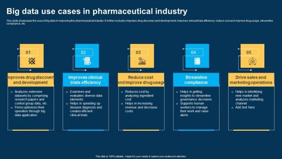 This slide showcases the uses of big data in improving the pharmaceutical industry. It further includes improves drug discovery and development, improves clinical trials efficiency, reduce cost and improve drug usage, streamline compliance, etc. Showcasing this set of slides titled Big Data Use Cases In Pharmaceutical Industry Ppt Infographics Inspiration pdf. The topics addressed in these templates are Improves Drug Discovery, Improves Clinical, Trials Efficiency. All the content presented in this PPT design is completely editable. Download it and make adjustments in color, background, font etc. as per your unique business setting. This slide showcases the uses of big data in improving the pharmaceutical industry. It further includes improves drug discovery and development, improves clinical trials efficiency, reduce cost and improve drug usage, streamline compliance, etc.