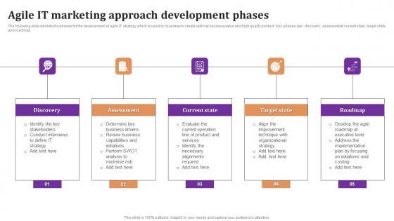 The following slide exhibits the phases for the development of agile IT strategy which is used by business to create optimal business value and high quality product. Key phases are discovery, assessment, current state, target state and roadmap Showcasing this set of slides titled Agile It Marketing Approach Development Phases Portrait Pdf The topics addressed in these templates are Discovery, Assessment, Current State All the content presented in this PPT design is completely editable. Download it and make adjustments in color, background, font etc. as per your unique business setting. The following slide exhibits the phases for the development of agile IT strategy which is used by business to create optimal business value and high quality product. Key phases are discovery, assessment, current state, target state and roadmap