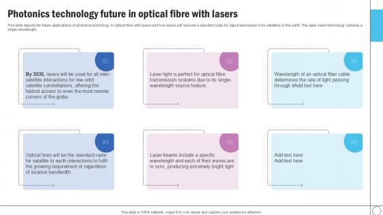 This slide depicts the future applications of photonics technology in optical fibre with lasers and how lasers will become a standard route for data transmission from satellites to the earth. The laser beam technology contains a single wavelength. Present like a pro with Fibers IT Photonics Technology Future In Optical Fibre With Lasers. Create beautiful presentations together with your team, using our easy-to-use presentation slides. Share your ideas in real-time and make changes on the fly by downloading our templates. So whether you are in the office, on the go, or in a remote location, you can stay in sync with your team and present your ideas with confidence. With Slidegeeks presentation got a whole lot easier. Grab these presentations today. This slide depicts the future applications of photonics technology in optical fibre with lasers and how lasers will become a standard route for data transmission from satellites to the earth. The laser beam technology contains a single wavelength.
