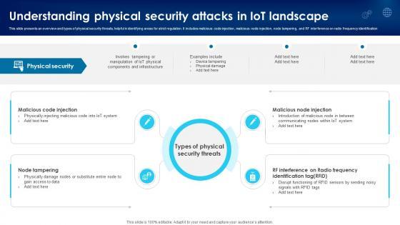 This slide presents an overview and types of physical security threats, helpful in identifying areas for strict regulation. It includes malicious code injection, malicious node injection, node tampering, and RF interference on radio frequency identification. Find highly impressive Building Trust With IoT Security Understanding Physical Security Attacks In IoT Landscape IoT SS V on Slidegeeks to deliver a meaningful presentation. You can save an ample amount of time using these presentation templates. No need to worry to prepare everything from scratch because Slidegeeks experts have already done a huge research and work for you. You need to download Building Trust With IoT Security Understanding Physical Security Attacks In IoT Landscape IoT SS V for your upcoming presentation. All the presentation templates are 100 percent editable and you can change the color and personalize the content accordingly. Download now This slide presents an overview and types of physical security threats, helpful in identifying areas for strict regulation. It includes malicious code injection, malicious node injection, node tampering, and RF interference on radio frequency identification.