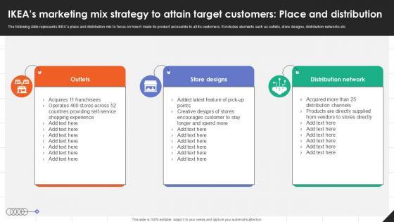 The following slide represents IKEAs place and distribution mix to focus on how it made its product accessible to all its customers. It includes elements such as outlets, store designs, distribution networks etc. Create an editable IKEAs Marketing Mix Strategy To Attain Target Customers Place PPT Slide Strategy SS V that communicates your idea and engages your audience. Whether you are presenting a business or an educational presentation, pre-designed presentation templates help save time. IKEAs Marketing Mix Strategy To Attain Target Customers Place PPT Slide Strategy SS V is highly customizable and very easy to edit, covering many different styles from creative to business presentations. Slidegeeks has creative team members who have crafted amazing templates. So, go and get them without any delay. The following slide represents IKEAs place and distribution mix to focus on how it made its product accessible to all its customers. It includes elements such as outlets, store designs, distribution networks etc.