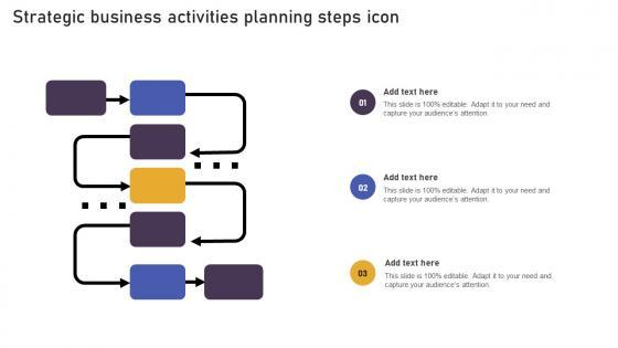 Pitch your topic with ease and precision using this Strategic Business Activities Planning Steps Icon Sample Pdf. This layout presents information on Strategic Business, Activities Planning. It is also available for immediate download and adjustment. So, changes can be made in the color, design, graphics or any other component to create a unique layout. Our Strategic Business Activities Planning Steps Icon Sample Pdf are topically designed to provide an attractive backdrop to any subject. Use them to look like a presentation pro.