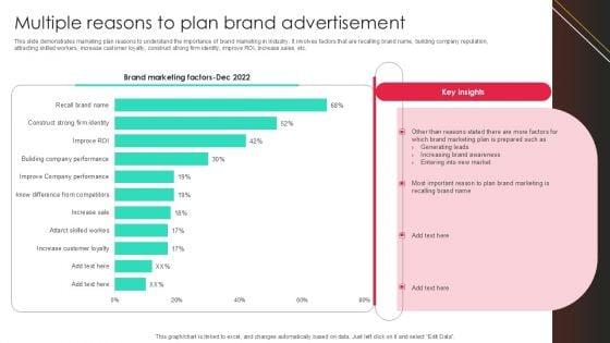 This slide demonstrates marketing plan reasons to understand the importance of brand marketing in industry. It involves factors that are recalling brand name, building company reputation, attracting skilled workers, increase customer loyalty, construct strong firm identity, improve ROI, increase sales, etc. Pitch your topic with ease and precision using this Multiple Reasons To Plan Brand Advertisement Clipart PDF. This layout presents information on Key Insights, New Market, Advertisement. It is also available for immediate download and adjustment. So, changes can be made in the color, design, graphics or any other component to create a unique layout.