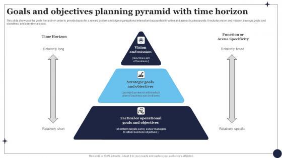 This slide showcase the goals hierarchy in order to provide bases for a reward system and align organizational interest and accountability within and across business units. It includes vision and mission, strategic goals and objectives, and operational goals. Showcasing this set of slides titled Goals And Objectives Planning Pyramid With Time Horizon Portrait Pdf The topics addressed in these templates are Vision And Mission, Strategic Goals, Objectives All the content presented in this PPT design is completely editable. Download it and make adjustments in color, background, font etc. as per your unique business setting. This slide showcase the goals hierarchy in order to provide bases for a reward system and align organizational interest and accountability within and across business units. It includes vision and mission, strategic goals and objectives, and operational goals.