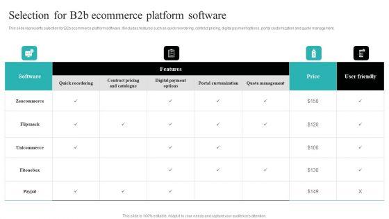 This slide represents selection for b2b ecommerce platform software. It includes features such as quick reordering, contract pricing, digital payment options, portal customization and quote management. Do you have an important presentation coming up Are you looking for something that will make your presentation stand out from the rest Look no further than Strategies For Successful Customer Base Development In B2b M Commerce Selection For B2b Ecommerce Platform Software Template PDF. With our professional designs, you can trust that your presentation will pop and make delivering it a smooth process. And with Slidegeeks, you can trust that your presentation will be unique and memorable. So why wait Grab Strategies For Successful Customer Base Development In B2b M Commerce Selection For B2b Ecommerce Platform Software Template PDF today and make your presentation stand out from the rest.