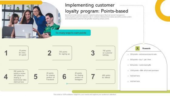 Mentioned slide outlines a points-based loyalty program that can assist managers in improving the customer retention rate. It contains detailed information about the points system and rewards the customer will get after reaching certain points. Explore a selection of the finest Implementing Customer Loyalty Program Points Based Themes PDF here. With a plethora of professionally designed and pre made slide templates, you can quickly and easily find the right one for your upcoming presentation. You can use our Implementing Customer Loyalty Program Points Based Themes PDF to effectively convey your message to a wider audience. Slidegeeks has done a lot of research before preparing these presentation templates. The content can be personalized and the slides are highly editable. Grab templates today from Slidegeeks.