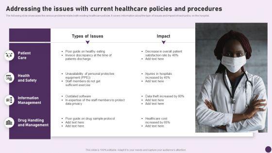 The following slide showcases the various problems related with existing healthcare policies. It covers information about the type of issues and impact of each policy on the hospital. Get a simple yet stunning designed Guide To Healthcare Services Administration Addressing The Issues With Current Healthcare Policies Information PDF. It is the best one to establish the tone in your meetings. It is an excellent way to make your presentations highly effective. So, download this PPT today from Slidegeeks and see the positive impacts. Our easy to edit Guide To Healthcare Services Administration Addressing The Issues With Current Healthcare Policies Information PDF can be your go to option for all upcoming conferences and meetings. So, what are you waiting for Grab this template today.
