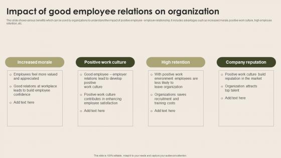 This slide shows various benefits which can be used by organizations to understand the impact of positive employee employer relationship. It includes advantages such as increased morale, positive work culture, high employee retention, etc. Make sure to capture your audiences attention in your business displays with our gratis customizable Impact Of Good Employee Relations On Nurturing Positive Work Culture Slides Pdf. These are great for business strategies, office conferences, capital raising or task suggestions. If you desire to acquire more customers for your tech business and ensure they stay satisfied, create your own sales presentation with these plain slides. This slide shows various benefits which can be used by organizations to understand the impact of positive employee employer relationship. It includes advantages such as increased morale, positive work culture, high employee retention, etc.