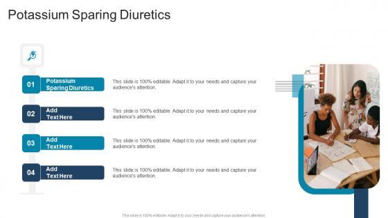 Presenting our innovatively designed set of slides titled Potassium Sparing Diuretics In Powerpoint And Google Slides Cpb This completely editable PowerPoint graphic exhibits Potassium Sparing Diuretics that will help you convey the message impactfully. It can be accessed with Google Slides and is available in both standard screen and widescreen aspect ratios. Apart from this, you can download this well structured PowerPoint template design in different formats like PDF, JPG, and PNG. So, click the download button now to gain full access to this PPT design. Our Potassium Sparing Diuretics In Powerpoint And Google Slides Cpb are topically designed to provide an attractive backdrop to any subject. Use them to look like a presentation pro.