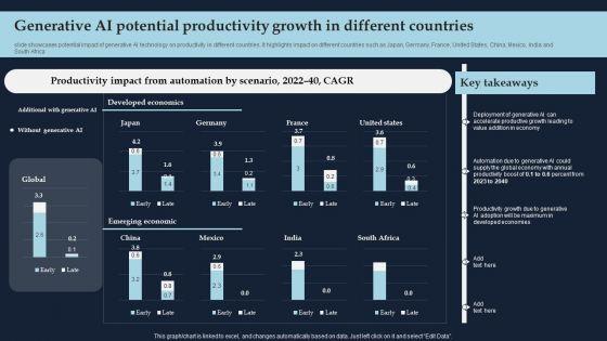 slide showcases potential impact of generative AI technology on productivity in different countries. It highlights impact on different countries such as Japan, Germany, France, United States, China, Mexico, India and South Africa. If you are looking for a format to display your unique thoughts, then the professionally designed Generative AI Potential Productivity Growth In Different Countries Brochure PDF is the one for you. You can use it as a Google Slides template or a PowerPoint template. Incorporate impressive visuals, symbols, images, and other charts. Modify or reorganize the text boxes as you desire. Experiment with shade schemes and font pairings. Alter, share or cooperate with other people on your work. Download Generative AI Potential Productivity Growth In Different Countries Brochure PDF and find out how to give a successful presentation. Present a perfect display to your team and make your presentation unforgettable.
