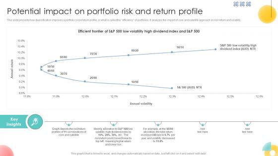 This slide presents how diversification improves a portfolios risk or return profile, or what is called the efficiency of portfolios. It analyzes the impact of core and satellite approach on risk return and volatility.From laying roadmaps to briefing everything in detail, our templates are perfect for you. You can set the stage with your presentation slides. All you have to do is download these easy-to-edit and customizable templates. Potential Impact On Portfolio Risk And Return Profile Strategic Investment Plan For Optimizing Risk SS V will help you deliver an outstanding performance that everyone would remember and praise you for. Do download this presentation today. This slide presents how diversification improves a portfolios risk or return profile, or what is called the efficiency of portfolios. It analyzes the impact of core and satellite approach on risk return and volatility.