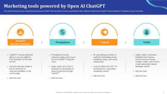 This slide showcases various marketing tools powered by ChatGPT that can help to increase organizational sales. Software mentioned are ChatGPT chrome extension, Promptheus, Copy.AI and viable. There are so many reasons you need a ChatGpt Comprehensive Guide Marketing Tools Powered By Open Ai ChatGpt Ppt Sample ChatGpt SS V. The first reason is you can not spend time making everything from scratch, Thus, Slidegeeks has made presentation templates for you too. You can easily download these templates from our website easily. This slide showcases various marketing tools powered by ChatGPT that can help to increase organizational sales. Software mentioned are ChatGPT chrome extension, Promptheus, Copy.AI and viable.