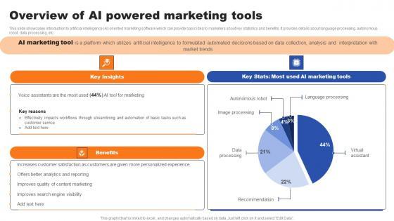 This slide showcases introduction to artificial intelligence AI oriented marketing software which can provide basic idea to marketers about key statistics and benefits. It provides details about language processing, autonomous robot, data processing, etc. The Overview Of AI Powered Marketing Tools Ppt Infographics Designs Download Pdf is a compilation of the most recent design trends as a series of slides. It is suitable for any subject or industry presentation, containing attractive visuals and photo spots for businesses to clearly express their messages. This template contains a variety of slides for the user to input data, such as structures to contrast two elements, bullet points, and slides for written information. Slidegeeks is prepared to create an impression. This slide showcases introduction to artificial intelligence AI oriented marketing software which can provide basic idea to marketers about key statistics and benefits. It provides details about language processing, autonomous robot, data processing, etc.
