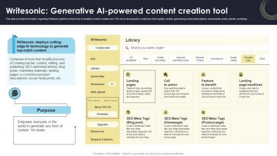 This slide provides information regarding Writesonic platform which is an AI-enabled content creation tool. The tool is developed to create top-notch quality content, generating product descriptions, social media posts, articles, and blogs. This Writesonic Generative AI-Powered Content Creation Tool How Generative AI Tools Work AI SS V from Slidegeeks makes it easy to present information on your topic with precision. It provides customization options, so you can make changes to the colors, design, graphics, or any other component to create a unique layout. It is also available for immediate download, so you can begin using it right away. Slidegeeks has done good research to ensure that you have everything you need to make your presentation stand out. Make a name out there for a brilliant performance. This slide provides information regarding Writesonic platform which is an AI-enabled content creation tool. The tool is developed to create top-notch quality content, generating product descriptions, social media posts, articles, and blogs.