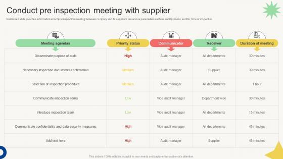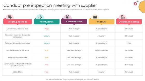 Mentioned slide provides information about pre inspection meeting between company and its suppliers on various parameters such as audit process, auditor, time of inspection. Do you have an important presentation coming up Are you looking for something that will make your presentation stand out from the rest Look no further than Vendor Management Audit Conduct Pre Inspection Meeting With Supplier. With our professional designs, you can trust that your presentation will pop and make delivering it a smooth process. And with Slidegeeks, you can trust that your presentation will be unique and memorable. So why wait Grab Vendor Management Audit Conduct Pre Inspection Meeting With Supplier today and make your presentation stand out from the rest Mentioned slide provides information about pre inspection meeting between company and its suppliers on various parameters such as audit process, auditor, time of inspection.