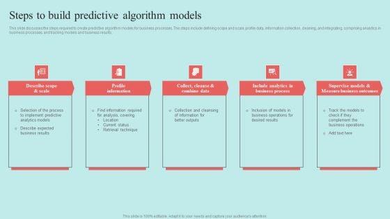 This slide discusses the steps required to create predictive algorithm models for business processes. The steps include defining scope and scale, profile data, information collection, cleaning, and integrating, comprising analytics in business processes, and tracking models and business results. Slidegeeks has constructed Predictive Analytics Methods Steps To Build Predictive Algorithm Models Themes PDF after conducting extensive research and examination. These presentation templates are constantly being generated and modified based on user preferences and critiques from editors. Here, you will find the most attractive templates for a range of purposes while taking into account ratings and remarks from users regarding the content. This is an excellent jumping off point to explore our content and will give new users an insight into our top notch PowerPoint Templates.