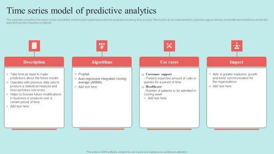 This slide talks about the time series model of predictive analytics that makes future outcome predictions by taking time as input. This model can be implemented in customer support services and healthcare industries to predict the expected number of queries or patients. Slidegeeks is here to make your presentations a breeze with Predictive Data Model Time Series Model Of Predictive Analytics Infographics PDF With our easy-to-use and customizable templates, you can focus on delivering your ideas rather than worrying about formatting. With a variety of designs to choose from, you are sure to find one that suits your needs. And with animations and unique photos, illustrations, and fonts, you can make your presentation pop. So whether you are giving a sales pitch or presenting to the board, make sure to check out Slidegeeks first