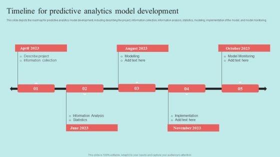 This slide depicts the roadmap for predictive analytics model development, including describing the project, information collection, information analysis, statistics, modeling, implementation of the model, and model monitoring. Do you have an important presentation coming up Are you looking for something that will make your presentation stand out from the rest Look no further than Predictive Data Model Timeline For Predictive Analytics Model Development Elements PDF. With our professional designs, you can trust that your presentation will pop and make delivering it a smooth process. And with Slidegeeks, you can trust that your presentation will be unique and memorable. So why wait Grab Predictive Data Model Timeline For Predictive Analytics Model Development Elements PDF today and make your presentation stand out from the rest