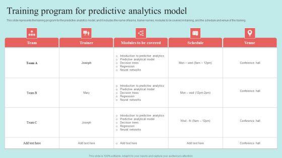 This slide represents the training program for the predictive analytics model, and it includes the name of teams, trainer names, modules to be covered in training, and the schedule and venue of the training. Find highly impressive Predictive Data Model Training Program For Predictive Analytics Model Microsoft PDF on Slidegeeks to deliver a meaningful presentation. You can save an ample amount of time using these presentation templates. No need to worry to prepare everything from scratch because Slidegeeks experts have already done a huge research and work for you. You need to download Predictive Data Model Training Program For Predictive Analytics Model Microsoft PDF for your upcoming presentation. All the presentation templates are 100 percent editable and you can change the color and personalize the content accordingly. Download now
