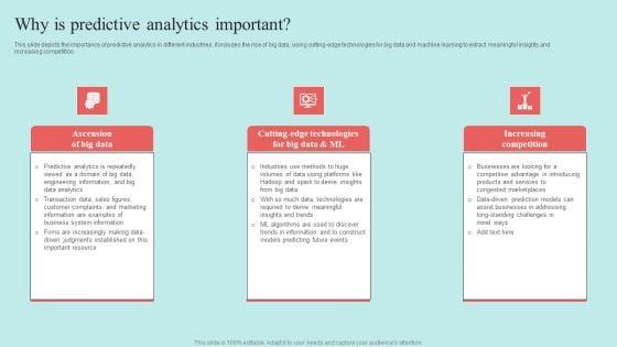 This slide depicts the importance of predictive analytics in different industries. It includes the rise of big data, using cutting-edge technologies for big data and machine learning to extract meaningful insights and increasing competition. Make sure to capture your audiences attention in your business displays with our gratis customizable Predictive Data Model Why Is Predictive Analytics Important Mockup PDF. These are great for business strategies, office conferences, capital raising or task suggestions. If you desire to acquire more customers for your tech business and ensure they stay satisfied, create your own sales presentation with these plain slides.