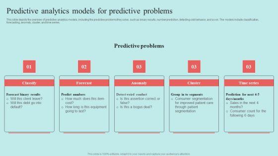 This slide depicts the overview of predictive analytics models, including the predictive problems they solve, such as binary results, number prediction, detecting odd behavior, and so on. The models include classification, forecasting, anomaly, cluster, and time series. The Predictive Analytics Methods Predictive Analytics Models For Predictive Problems Graphics PDF is a compilation of the most recent design trends as a series of slides. It is suitable for any subject or industry presentation, containing attractive visuals and photo spots for businesses to clearly express their messages. This template contains a variety of slides for the user to input data, such as structures to contrast two elements, bullet points, and slides for written information. Slidegeeks is prepared to create an impression.