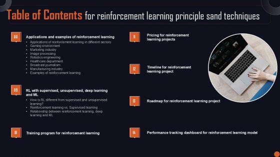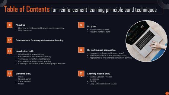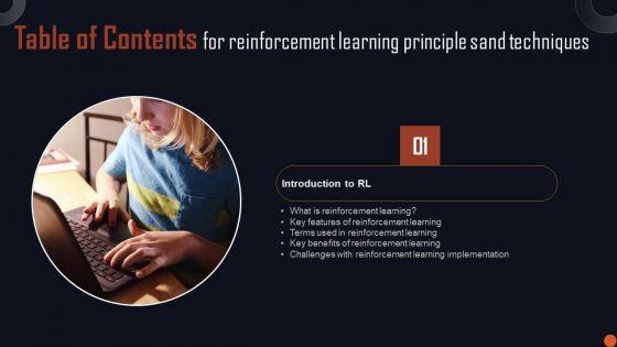 Do you have to make sure that everyone on your team knows about any specific topic I yes, then you should give Table Of Contents For Reinforcement Learning Principle Sand Techniques Sample PDF a try. Our experts have put a lot of knowledge and effort into creating this impeccable Table Of Contents For Reinforcement Learning Principle Sand Techniques Sample PDF. You can use this template for your upcoming presentations, as the slides are perfect to represent even the tiniest detail. You can download these templates from the Slidegeeks website and these are easy to edit. So grab these today