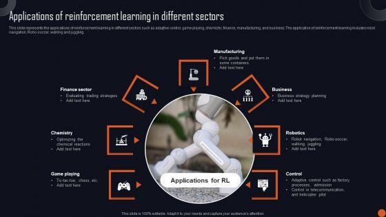 This slide represents the applications of reinforcement learning in different sectors such as adaptive control, game playing, chemistry, finance, manufacturing, and business. The application of reinforcement learning includes robot navigation, Robo-soccer, walking and juggling. Slidegeeks is one of the best resources for PowerPoint templates. You can download easily and regulate Reinforcement Learning Principles And Techniques Applications Of Reinforcement Learning Different Slides PDF for your personal presentations from our wonderful collection. A few clicks is all it takes to discover and get the most relevant and appropriate templates. Use our Templates to add a unique zing and appeal to your presentation and meetings. All the slides are easy to edit and you can use them even for advertisement purposes.