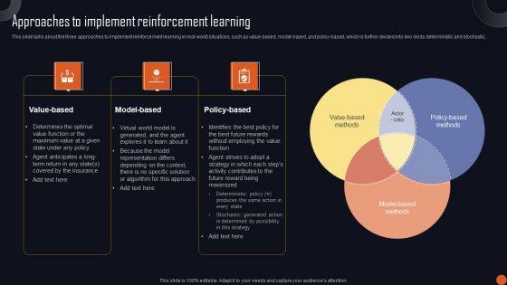 This slide talks about the three approaches to implement reinforcement learning in real-world situations, such as value-based, model-based, and policy-based, which is further divided into two kinds deterministic and stochastic. Want to ace your presentation in front of a live audience Our Reinforcement Learning Principles And Techniques Approaches To Implement Reinforcement Learning Slides PDF can help you do that by engaging all the users towards you. Slidegeeks experts have put their efforts and expertise into creating these impeccable powerpoint presentations so that you can communicate your ideas clearly. Moreover, all the templates are customizable, and easy to edit and downloadable. Use these for both personal and commercial use.