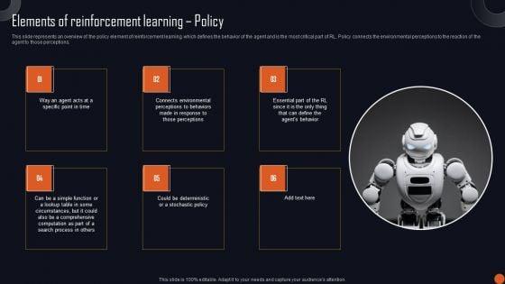 This slide represents an overview of the policy element of reinforcement learning, which defines the behavior of the agent and is the most critical part of RL. Policy connects the environmental perceptions to the reaction of the agent to those perceptions. Get a simple yet stunning designed Reinforcement Learning Principles And Techniques Elements Of Reinforcement Learning Policy Topics PDF. It is the best one to establish the tone in your meetings. It is an excellent way to make your presentations highly effective. So, download this PPT today from Slidegeeks and see the positive impacts. Our easy to edit Reinforcement Learning Principles And Techniques Elements Of Reinforcement Learning Policy Topics PDF can be your go to option for all upcoming conferences and meetings. So, what are you waiting for Grab this template today.