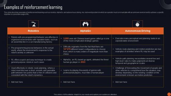 This slide describes examples of reinforcement learning such as robotics, AlphaGo, and autonomous driving. Any real-world problem in which an operator must communicate with an unknown environment to achieve a specific objective is a possible usage of RL. Slidegeeks is here to make your presentations a breeze with Reinforcement Learning Principles And Techniques Examples Of Reinforcement Learning Rules PDF With our easy to use and customizable templates, you can focus on delivering your ideas rather than worrying about formatting. With a variety of designs to choose from, you are sure to find one that suits your needs. And with animations and unique photos, illustrations, and fonts, you can make your presentation pop. So whether you are giving a sales pitch or presenting to the board, make sure to check out Slidegeeks first.