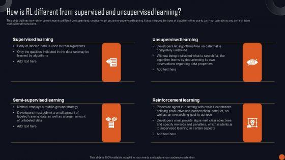 This slide outlines how reinforcement learning differs from supervised, unsupervised, and semi-supervised learning. It also includes the types of algorithms they use to carry out operations and some of them work without instructions. Whether you have daily or monthly meetings, a brilliant presentation is necessary. Reinforcement Learning Principles And Techniques How Is RL Different From Supervised Unsupervised Mockup PDF can be your best option for delivering a presentation. Represent everything in detail using Reinforcement Learning Principles And Techniques How Is RL Different From Supervised Unsupervised Mockup PDF and make yourself stand out in meetings. The template is versatile and follows a structure that will cater to your requirements. All the templates prepared by Slidegeeks are easy to download and edit. Our research experts have taken care of the corporate themes as well. So, give it a try and see the results.