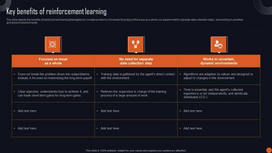 This slide depicts the benefits of reinforcement learning that applies to complex problems. It includes focusing on the issue as a whole, no requirement for separate data collection steps, and working in uncertain and dynamic environments. Find highly impressive Reinforcement Learning Principles And Techniques Key Benefits Of Reinforcement Learning Themes PDF on Slidegeeks to deliver a meaningful presentation. You can save an ample amount of time using these presentation templates. No need to worry to prepare everything from scratch because Slidegeeks experts have already done a huge research and work for you. You need to download Reinforcement Learning Principles And Techniques Key Benefits Of Reinforcement Learning Themes PDF for your upcoming presentation. All the presentation templates are 100 percent editable and you can change the color and personalize the content accordingly. Download now.