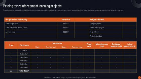 This slide represents the pricing for building reinforcement learning models, including project cost summary, amount, project details such as company name, project name, project lead, and project start date. This modern and well-arranged Reinforcement Learning Principles And Techniques Pricing For Reinforcement Learning Projects Slides PDF provides lots of creative possibilities. It is very simple to customize and edit with the Powerpoint Software. Just drag and drop your pictures into the shapes. All facets of this template can be edited with Powerpoint, no extra software is necessary. Add your own material, put your images in the places assigned for them, adjust the colors, and then you can show your slides to the world, with an animated slide included.