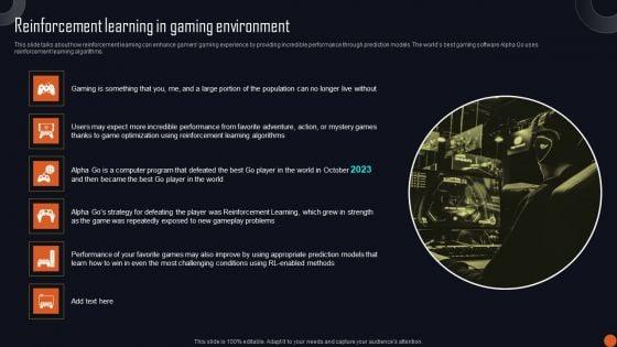 This slide talks about how reinforcement learning can enhance gamers gaming experience by providing incredible performance through prediction models. The worlds best gaming software Alpha Go uses reinforcement learning algorithms. Explore a selection of the finest Reinforcement Learning Principles And Techniques Reinforcement Learning In Gaming Environment Demonstration PDF here. With a plethora of professionally designed and pre-made slide templates, you can quickly and easily find the right one for your upcoming presentation. You can use our Reinforcement Learning Principles And Techniques Reinforcement Learning In Gaming Environment Demonstration PDF to effectively convey your message to a wider audience. Slidegeeks has done a lot of research before preparing these presentation templates. The content can be personalized and the slides are highly editable. Grab templates today from Slidegeeks.