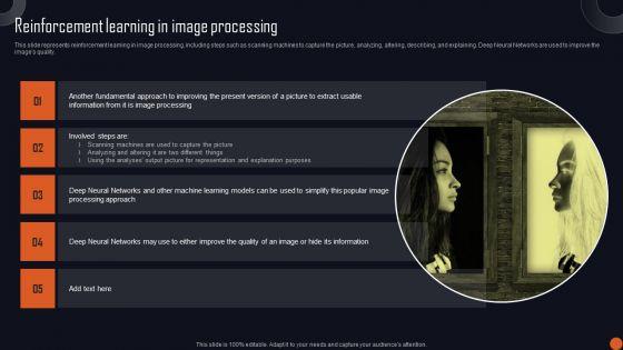 This slide represents reinforcement learning in image processing, including steps such as scanning machines to capture the picture, analyzing, altering, describing, and explaining. Deep Neural Networks are used to improve the images quality. The Reinforcement Learning Principles And Techniques Reinforcement Learning In Image Processing Portrait PDF is a compilation of the most recent design trends as a series of slides. It is suitable for any subject or industry presentation, containing attractive visuals and photo spots for businesses to clearly express their messages. This template contains a variety of slides for the user to input data, such as structures to contrast two elements, bullet points, and slides for written information. Slidegeeks is prepared to create an impression.