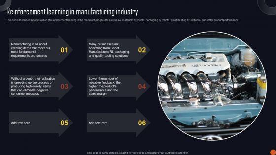 This slide describes the application of reinforcement learning in the manufacturing field to pick heavy materials by cobots, packaging by robots, quality testing by software, and better product performance. Are you searching for a Reinforcement Learning Principles And Techniques Reinforcement Learning In Manufacturing Industry Sample PDF that is uncluttered, straightforward, and original Its easy to edit, and you can change the colors to suit your personal or business branding. For a presentation that expresses how much effort you have put in, this template is ideal With all of its features, including tables, diagrams, statistics, and lists, its perfect for a business plan presentation. Make your ideas more appealing with these professional slides. Download Reinforcement Learning Principles And Techniques Reinforcement Learning In Manufacturing Industry Sample PDF from Slidegeeks today.