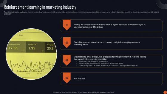 This slide outlines the application of reinforcement learning in marketing to overcome the problem of finding the correct audience and higher returns on investment. It provides a real-time display as impressions, profit margins, and so on. Retrieve professionally designed Reinforcement Learning Principles And Techniques Reinforcement Learning In Marketing Industry Themes PDF to effectively convey your message and captivate your listeners. Save time by selecting pre-made slideshows that are appropriate for various topics, from business to educational purposes. These themes come in many different styles, from creative to corporate, and all of them are easily adjustable and can be edited quickly. Access them as PowerPoint templates or as Google Slides themes. You do not have to go on a hunt for the perfect presentation because Slidegeeks got you covered from everywhere.