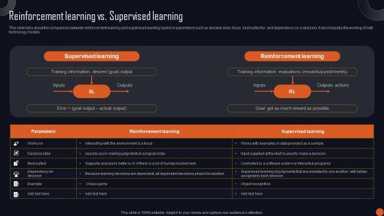 This slide talks about the comparison between reinforcement learning and supervised learning based on parameters such as decision style, focus, best suited for, and dependency on a decision. It also includes the working of both technology models. Presenting this PowerPoint presentation, titled Reinforcement Learning Principles And Techniques Reinforcement Learning Vs Supervised Learning Structure PDF, with topics curated by our researchers after extensive research. This editable presentation is available for immediate download and provides attractive features when used. Download now and captivate your audience. Presenting this Reinforcement Learning Principles And Techniques Reinforcement Learning Vs Supervised Learning Structure PDF. Our researchers have carefully researched and created these slides with all aspects taken into consideration. This is a completely customizable Reinforcement Learning Principles And Techniques Reinforcement Learning Vs Supervised Learning Structure PDF that is available for immediate downloading. Download now and make an impact on your audience. Highlight the attractive features available with our PPTs.