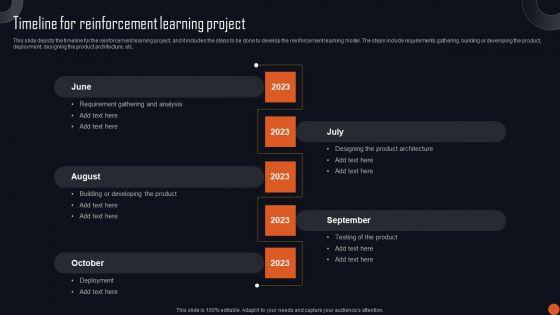 This slide depicts the timeline for the reinforcement learning project, and it includes the steps to be done to develop the reinforcement learning model. The steps include requirements gathering, building or developing the product, deployment, designing the product architecture, etc. Do you know about Slidesgeeks Reinforcement Learning Principles And Techniques Timeline For Reinforcement Learning Project Mockup PDF These are perfect for delivering any kind od presentation. Using it, create PowerPoint presentations that communicate your ideas and engage audiences. Save time and effort by using our pre-designed presentation templates that are perfect for a wide range of topic. Our vast selection of designs covers a range of styles, from creative to business, and are all highly customizable and easy to edit. Download as a PowerPoint template or use them as Google Slides themes.