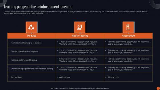 This slide depicts the reinforcement learning training program for employees in the organization, including modules to be covered, mode of training, and assessment method. The module covers reinforcement learning specialization, reinforcement learning in Python, and so on. Find a pre-designed and impeccable Reinforcement Learning Principles And Techniques Training Program For Reinforcement Learning Introduction PDF. The templates can ace your presentation without additional effort. You can download these easy-to-edit presentation templates to make your presentation stand out from others. So, what are you waiting for Download the template from Slidegeeks today and give a unique touch to your presentation.
