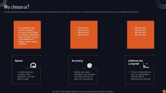This slide depicts the reasons for clients choosing the reinforcement learning provider company for RL services. The company characteristics include speed, accuracy, and addressing the long tail. Want to ace your presentation in front of a live audience Our Reinforcement Learning Principles And Techniques Why Choose Us Background PDF can help you do that by engaging all the users towards you.. Slidegeeks experts have put their efforts and expertise into creating these impeccable powerpoint presentations so that you can communicate your ideas clearly. Moreover, all the templates are customizable, and easy-to-edit and downloadable. Use these for both personal and commercial use.