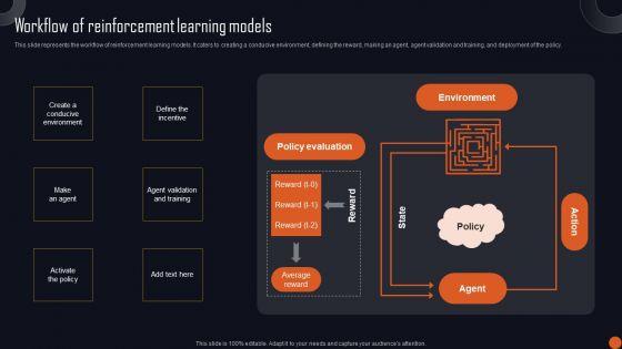 This slide represents the workflow of reinforcement learning models. It caters to creating a conducive environment, defining the reward, making an agent, agent validation and training, and deployment of the policy. There are so many reasons you need a Reinforcement Learning Principles And Techniques Workflow Of Reinforcement Learning Models Infographics PDF. The first reason is you can not spend time making everything from scratch, Thus, Slidegeeks has made presentation templates for you too. You can easily download these templates from our website easily.