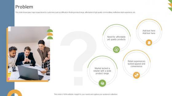 This slide showcases major issues faced by customers such as difficulty in finding product range, affordable and high quality commodities, ineffective retail experience, etc. Slidegeeks has constructed Problem General Merchandising Store Business Model BMC SS V after conducting extensive research and examination. These presentation templates are constantly being generated and modified based on user preferences and critiques from editors. Here, you will find the most attractive templates for a range of purposes while taking into account ratings and remarks from users regarding the content. This is an excellent jumping-off point to explore our content and will give new users an insight into our top-notch PowerPoint Templates. This slide showcases major issues faced by customers such as difficulty in finding product range, affordable and high quality commodities, ineffective retail experience, etc.