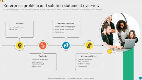 The following slide highlights the summary of business problem with solution to understand its cause and impact. It includes analysis of problem, possible solutions and review of audience. Persuade your audience using this Enterprise Problem And Solution Statement Overview Formats PDF. This PPT design covers four stages, thus making it a great tool to use. It also caters to a variety of topics including Problem, Analysis, Review Audience. Download this PPT design now to present a convincing pitch that not only emphasizes the topic but also showcases your presentation skills.