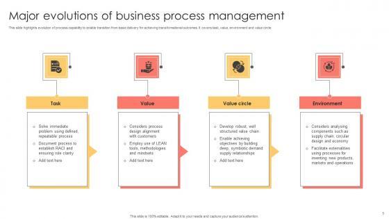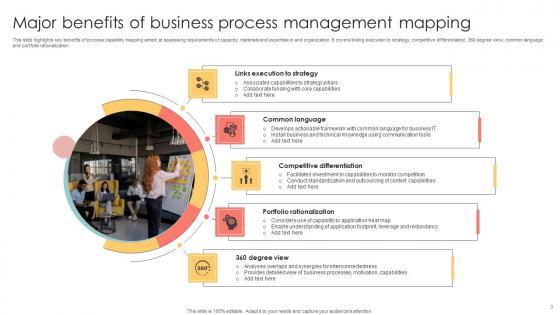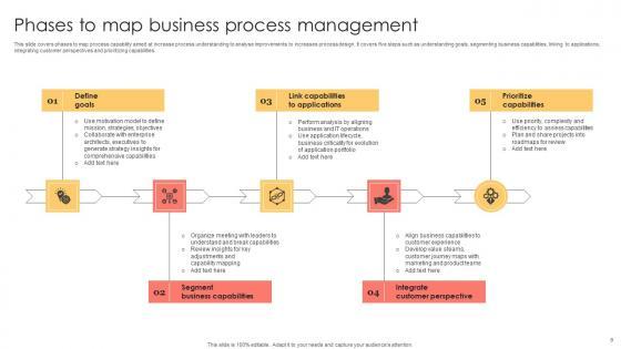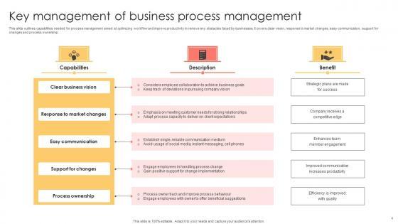 Improve your presentation delivery using this Business Process Management Capability Ppt Powerpoint Presentation Complete Deck With Slides. Support your business vision and objectives using this well structured PPT deck. This template offers a great starting point for delivering beautifully designed presentations on the topic of your choice. Comprising twelve this professionally designed template is all you need to host discussion and meetings with collaborators. Each slide is self explanatory and equipped with high quality graphics that can be adjusted to your needs. Therefore, you will face no difficulty in portraying your desired content using this PPT slideshow. This PowerPoint slideshow contains every important element that you need for a great pitch. It is not only editable but also available for immediate download and utilization. The color, font size, background, shapes everything can be modified to create your unique presentation layout. Therefore, download it now. Our Business Process Management Capability Ppt Powerpoint Presentation Complete Deck With Slides are topically designed to provide an attractive backdrop to any subject. Use them to look like a presentation pro.