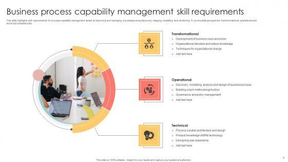 This slide highlights skill requirements for process capability management aimed at improving and managing processes using discovery, mapping, modelling and monitoring. It covers skills grouped into transformational, operational and technical competencies. Showcasing this set of slides titled Business Process Capability Management Skill Requirements Icons Pdf. The topics addressed in these templates are Transformational, Operational, Technical . All the content presented in this PPT design is completely editable. Download it and make adjustments in color, background, font etc. as per your unique business setting. This slide highlights skill requirements for process capability management aimed at improving and managing processes using discovery, mapping, modelling and monitoring. It covers skills grouped into transformational, operational and technical competencies.