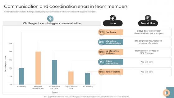 Mentioned slide demonstrates challenges faced by company in communication with team members with respective descriptions.Present like a pro with Communication And Coordination Errors In Team Office Process Optimization To Increase Cost Efficiency. Create beautiful presentations together with your team, using our easy-to-use presentation slides. Share your ideas in real-time and make changes on the fly by downloading our templates. So whether you are in the office, on the go, or in a remote location, you can stay in sync with your team and present your ideas with confidence. With Slidegeeks presentation got a whole lot easier. Grab these presentations today. Mentioned slide demonstrates challenges faced by company in communication with team members with respective descriptions.